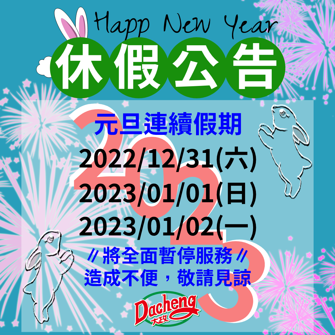 2022/12/31(六)~2023/1/2(一) 適逢元旦連續假期